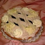 Hardewenerbodem met luchtige kersenbavarois, een dikke laag chocolade bisquit en weer een dikke laag kirschbavarois.
