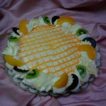 Afgewerkt met slagroom, kiwi, perzik, witte chocoladeschaafsel, en chocolade gallettes.